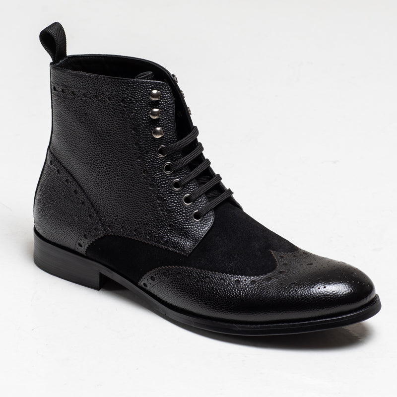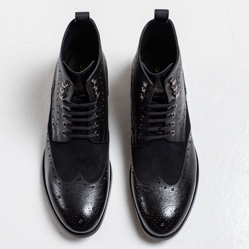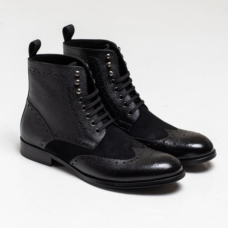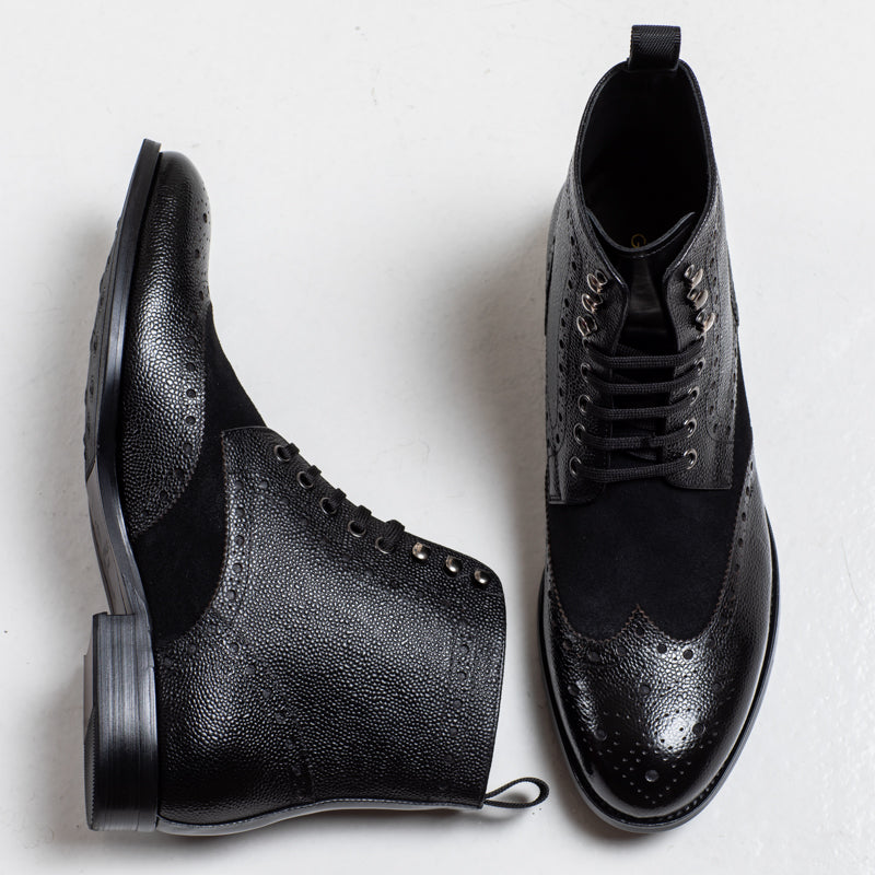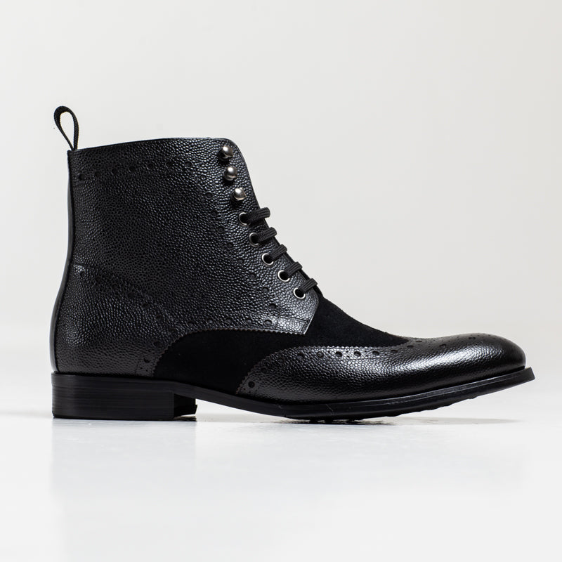 The Arsenal boot brings together a mix of textures — smooth burnished leather through the center, paired with a grain finish along the sides and toe. Brogue perforations run across the upper.