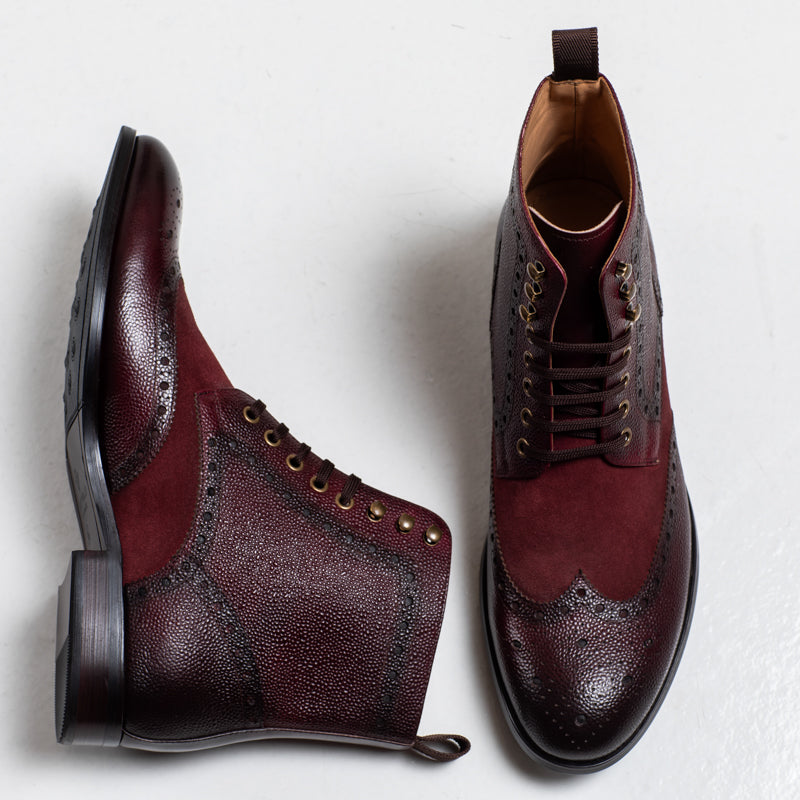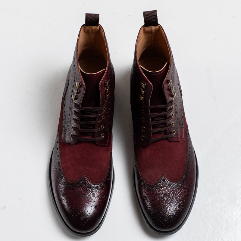 The Arsenal boot brings together a mix of textures — smooth burnished leather through the center, paired with a grain finish along the sides and toe. Brogue perforations run across the upper.