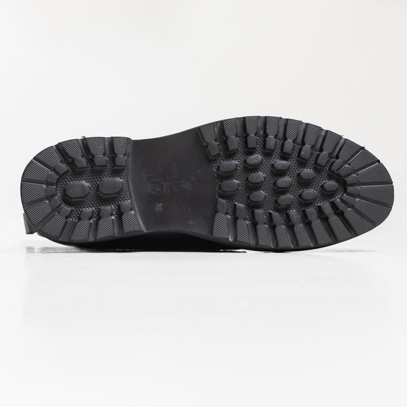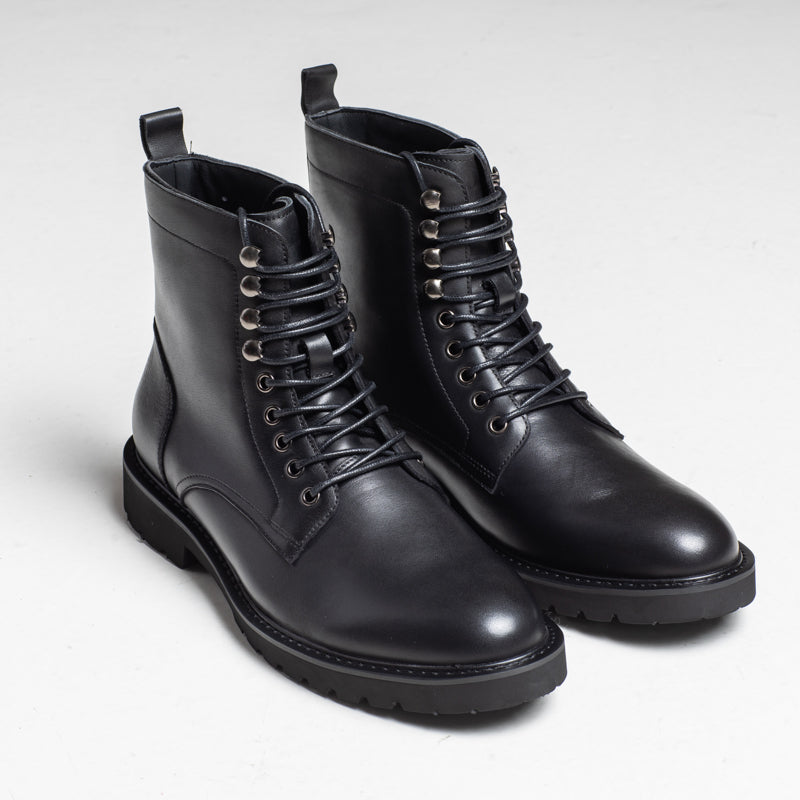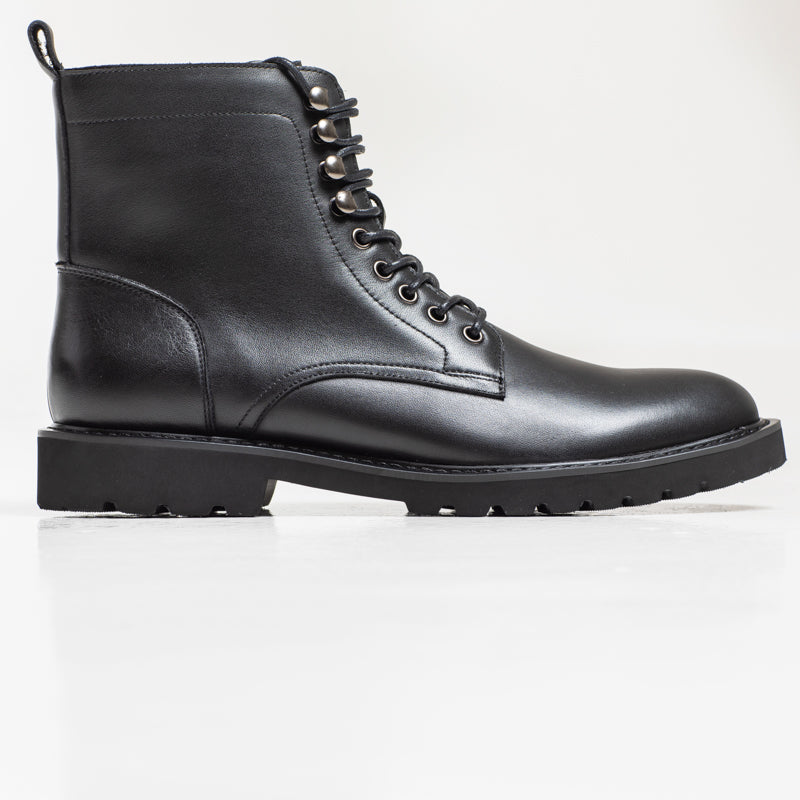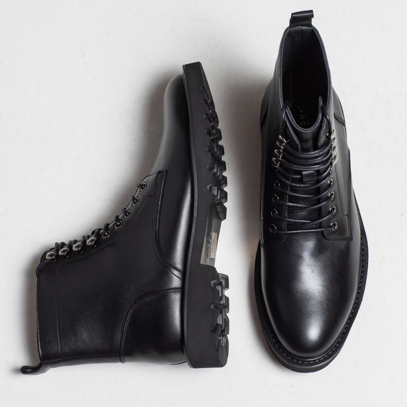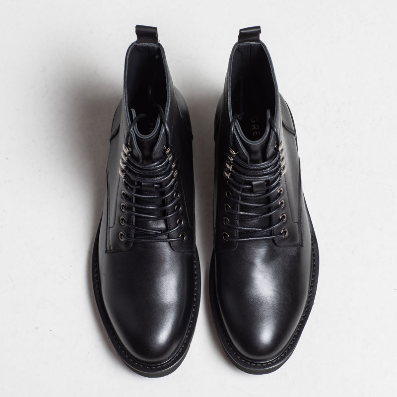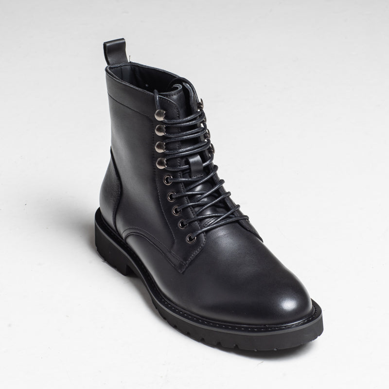A polished black leather lace-up boot with metal hardware and a clean, modern silhouette. Finished with a durable rubber sole, making it a solid choice for autumn and winter outfits.